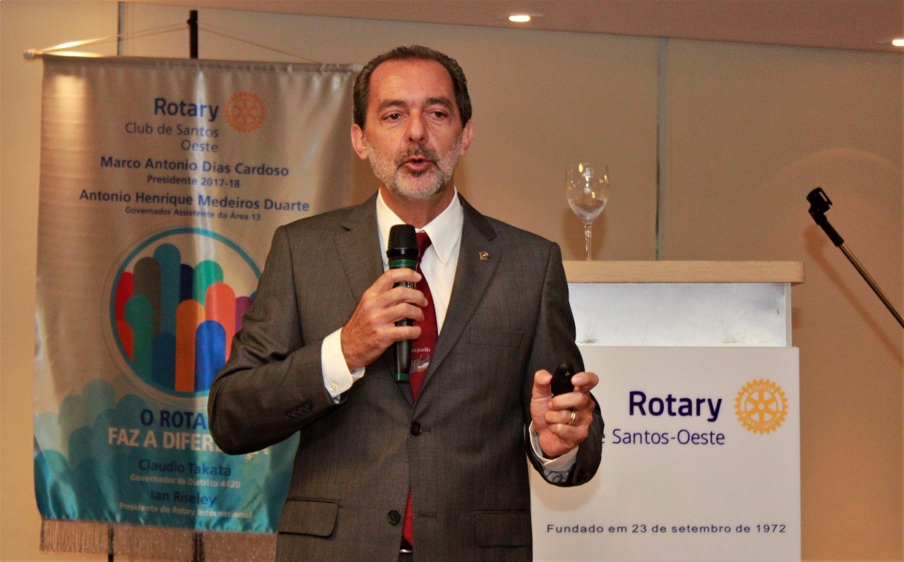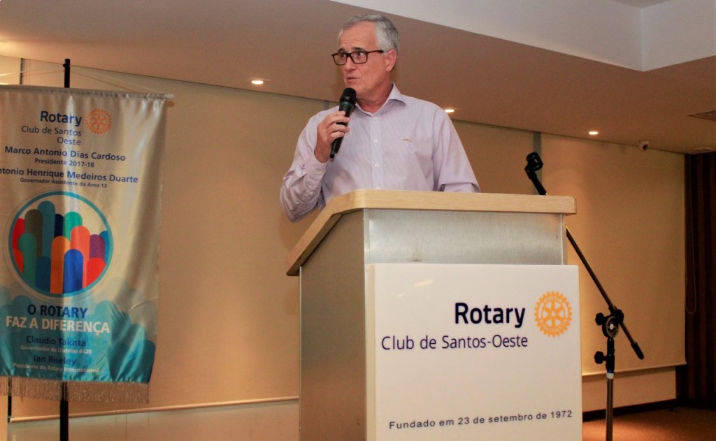 O Governador 2004-05 do D 4420 e ex Coordenador Zonal da Fundação Rotária brindou os companheiros do Santos Oeste, no último dia 29/9 com uma palestra especial, quando relatou suas inúmeras experiências em suas jornadas como dirigente de Rotary em visitas a projetos. São ações particulares em cada comunidade que mudam a vida das pessoas, afirmou ele. Aproveitou para elogiar a trajet´roia dos 45 anos do Santos Oeste.