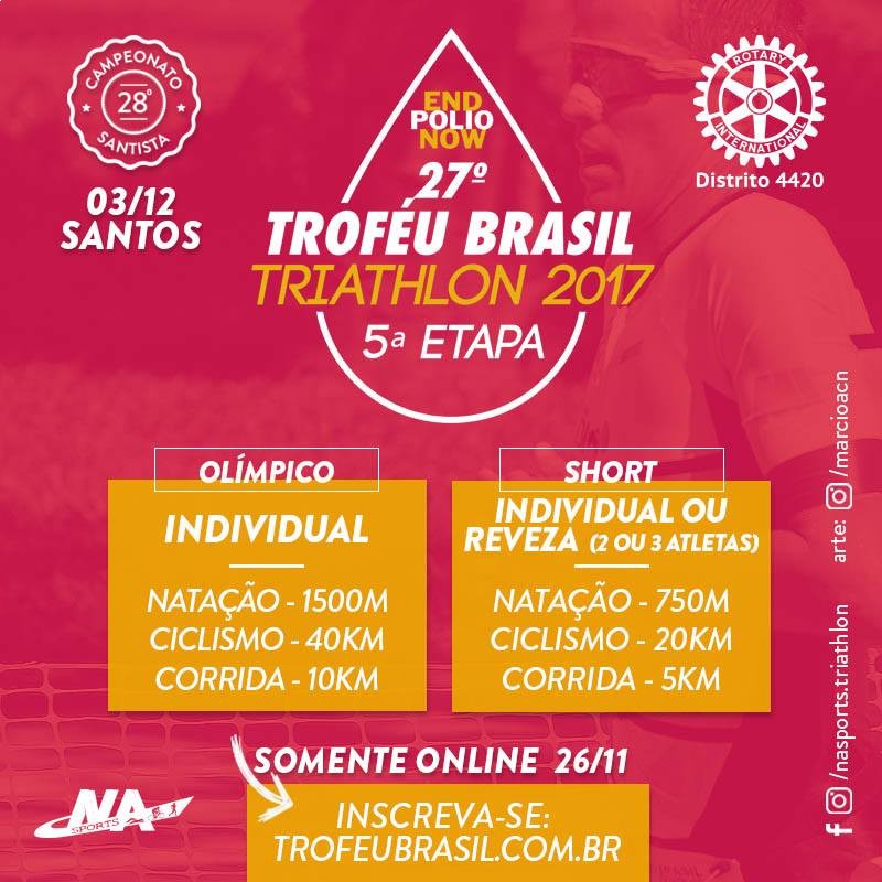 Dia 3/12 próximo a 5a etapa do 27o Troféu Brasil de Triatlhon, em Santos promove o Projeto da Erradicação da Pólio e conta com a participação de todos os rotarianos para acompanhar essa etapa que prevê 800 participantes de todo o Brasil. Organizada pela NSport, do companheiro Núbio do Santos Oeste, já o segundo ano que é dedicado ao maior projeto do Rotary International.