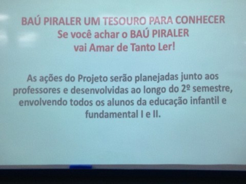 A partir da 2a quinzena de agosto todos os professores serão envolvidos e para todos entrarem no clima, os livros serão acondicionados em BAÚS que circulará pelas classes pelo menos um dia da semana.